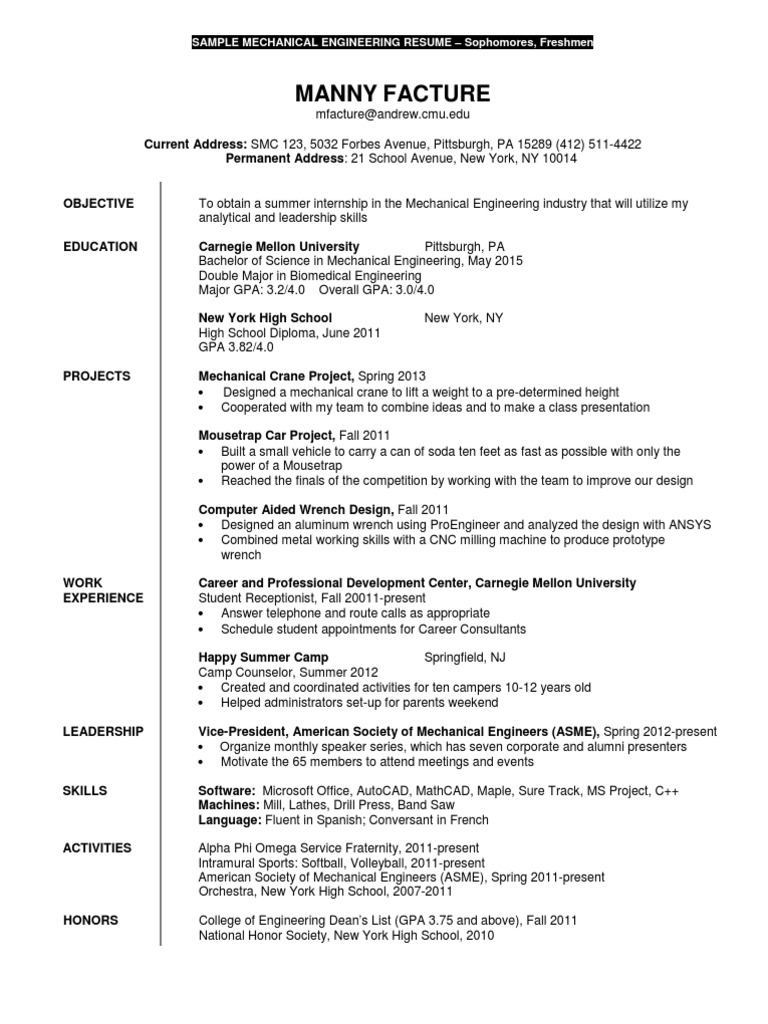 Meche Sample Resumes Carnegie Mellon University Mechanical