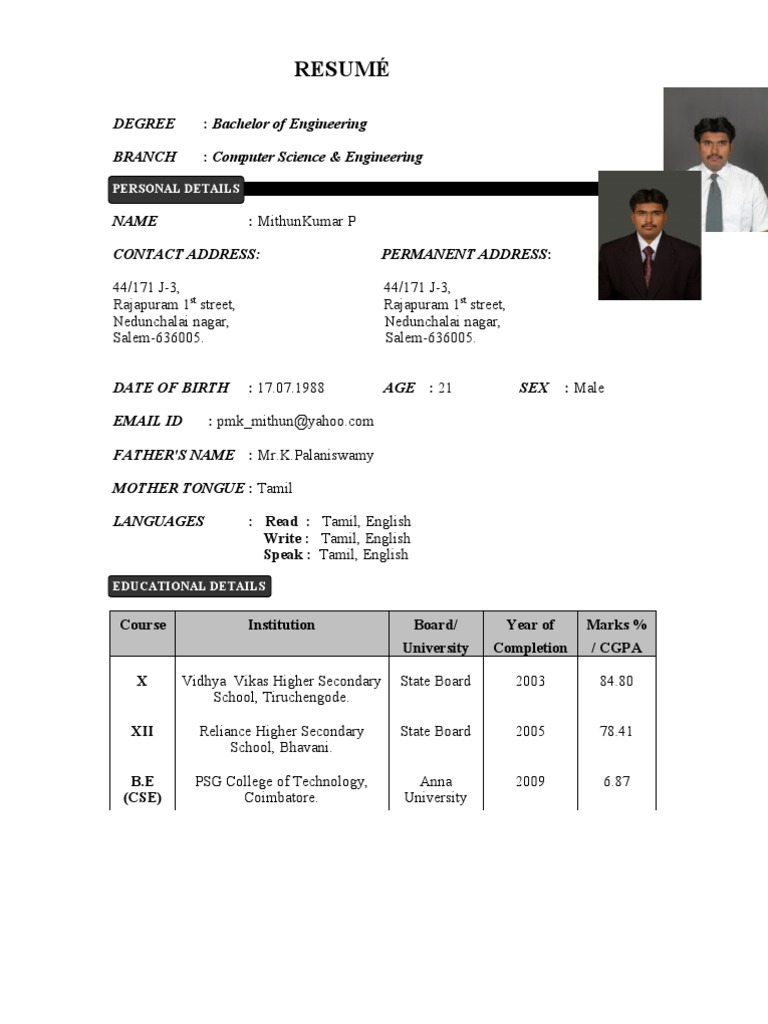 Resume Format For Btech Freshers Pdf Karir Previ Us
