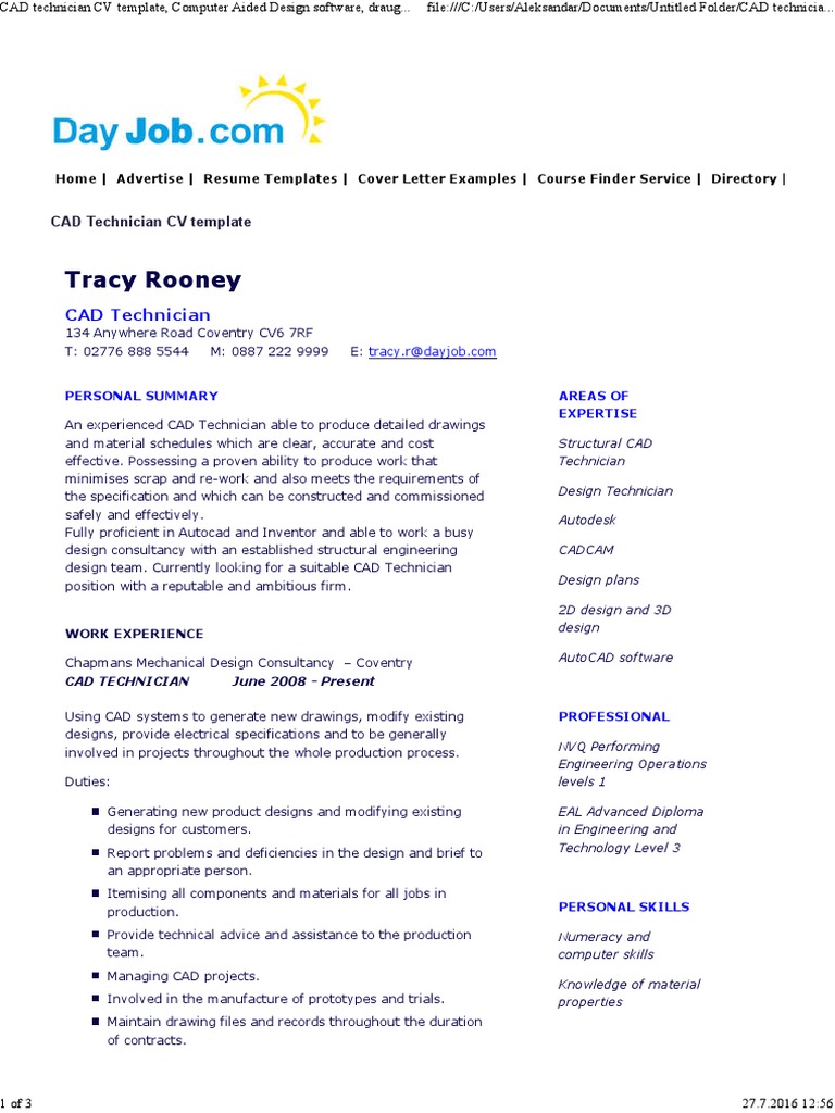 Cad Technician Cv Template Computer Aided Design Auto Cad