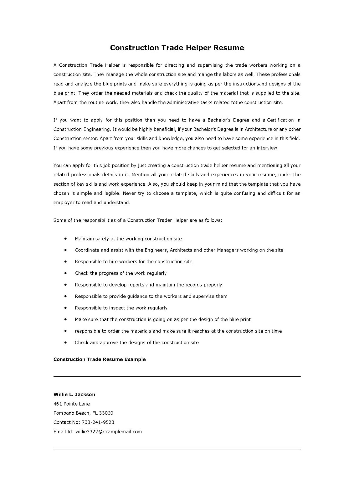 Construction Carpenter S Assistant Resume Sample Monster Com