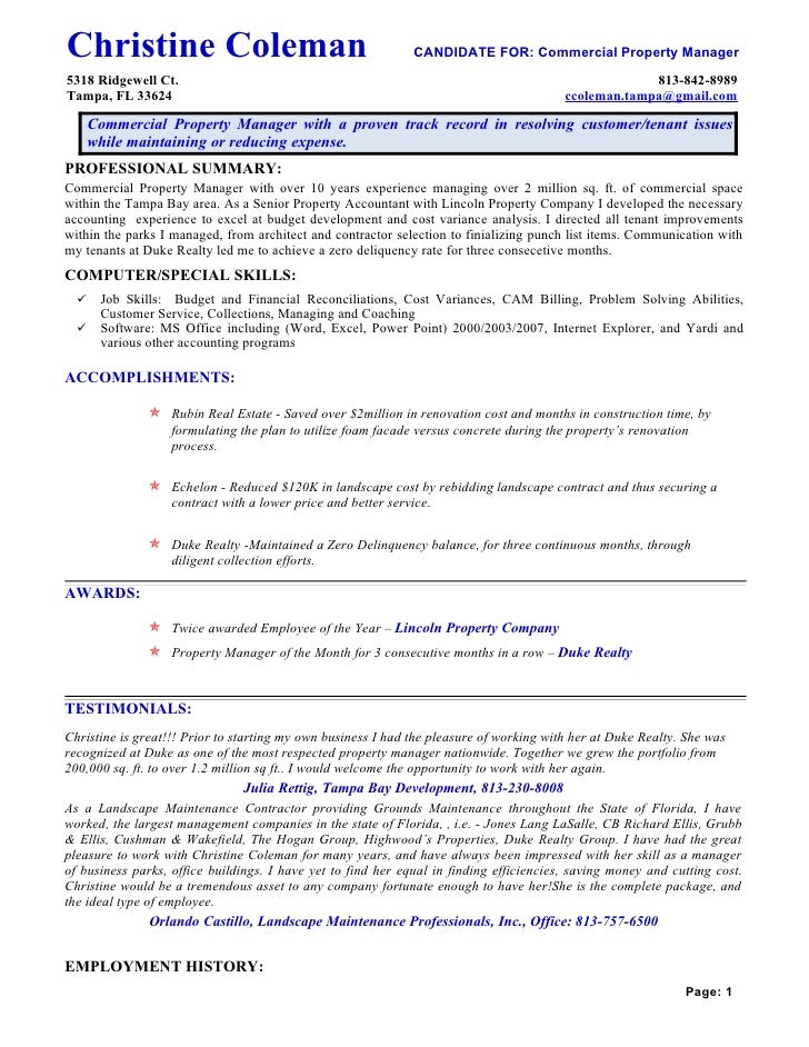 Property management resume examples. Crafting a property management assistant resume that catches the attention of hiring managers is paramount to getting the job and livecareer is here to help you stand out from the competition. Sample resume for a commercial property manager when it comes to managing a commercial building property managers have a variety of responsibilities. Xavier has substantial residential management experience so he is in a good position to look for more such roles. You may also want to include a headline or summary statement that clearly communicates your goals and qualifications.