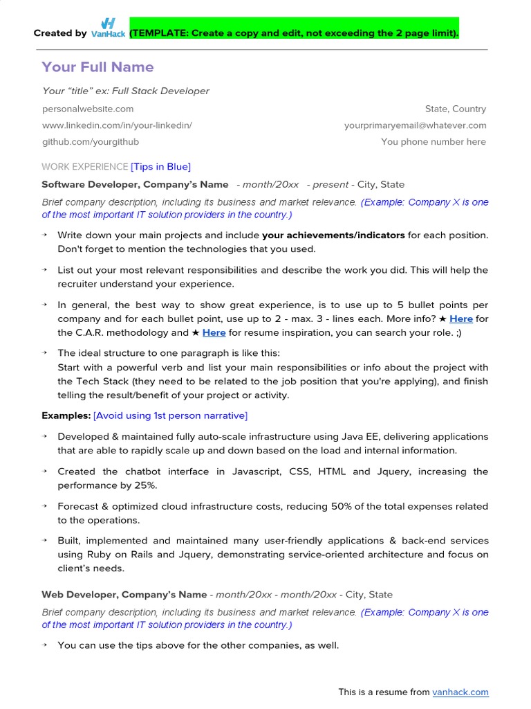 Vanhack Resume Template With Tips Programmer World Wide Web
