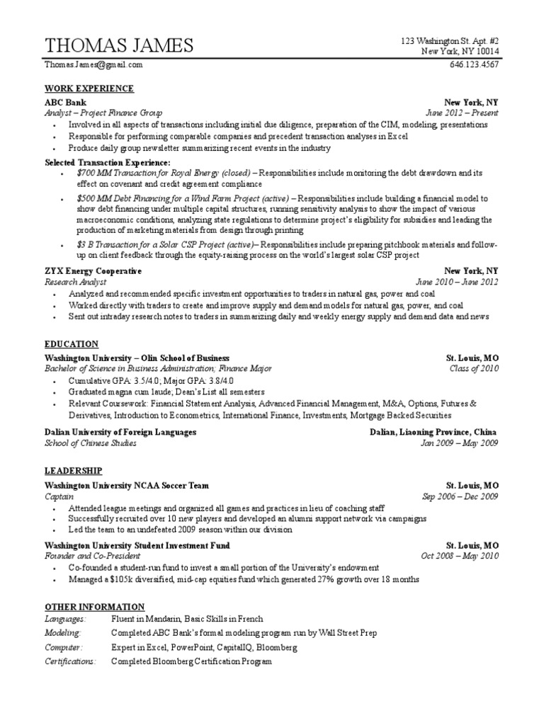 Wso Experienced Deals Resume Templatev3 Financial Analyst